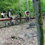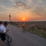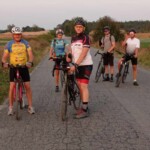 Trasa biegła po znanych i lubianych przez nas terenach leśnych w okolicy Bolewic. Mimo upalnej pogody jechało się dobrze i humory dopisywały. Na trasie musieliśmy przerzucić rowery przez powalone drzewo – była to okazja do zrobienia kilku fotek. W Bolewicach mogliśmy podziwiać piękny zachód słońca, z wierzą RTV w tle 🙂