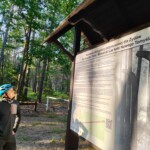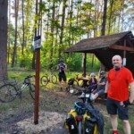 Dłuższe postoje zrobiliśmy pod leśnymi wiatami, gdzie mogliśmy odpocząć i podyskutować. Zatrzymaliśmy się też przy tablicy informacyjnej o Niemieckim obozie pracy przymusowej dla Żydów przy autostradzie A2- ważne miejsce, które przypomina o trudnej historii tych terenów.
